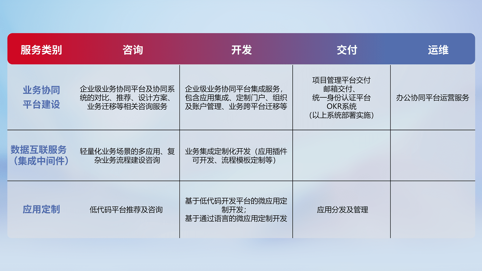 针对钉钉、、、企微、、IDaas等平台级产品提供产品的规划、、方案、、交付、、定制化开发等服务,,,,实现如统一协同办公、、、智能客户服务、、混合会议管理、、、智能数据查询、、、、等业务场景,,,实现数字化转型。。。
